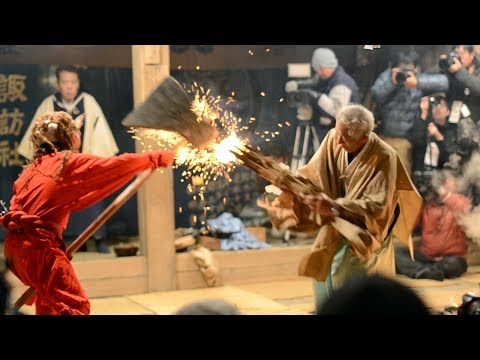 夕方、日が暮れると神輿が練り込みます。そして、祭りが始まります。 境内の大松明に明かりがともされ境内は明るくなります。 釜が清められ、神子による舞が始まります。 明け方には赤鬼が大まさかりを持って登場すると会場は熱気に包まれます。 真冬の氷点下でも熱いです。